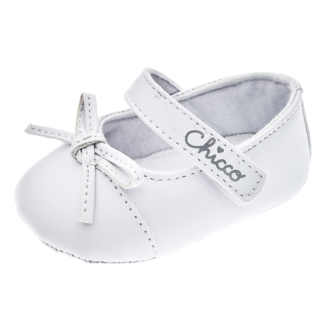 Scarpa CHICCO modello ballerina linea culla in ecopelle con chiusura velcro e fiocchetto applicato.