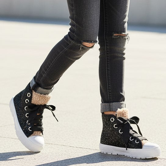 Scarpa SPINDOCTOR linea DXO con glitter ed applicazione in ecopelliccia effetto teddy , chiusura con lacci e zip laterale per facilitare la calzata, fondo in gomma antiscivolo.