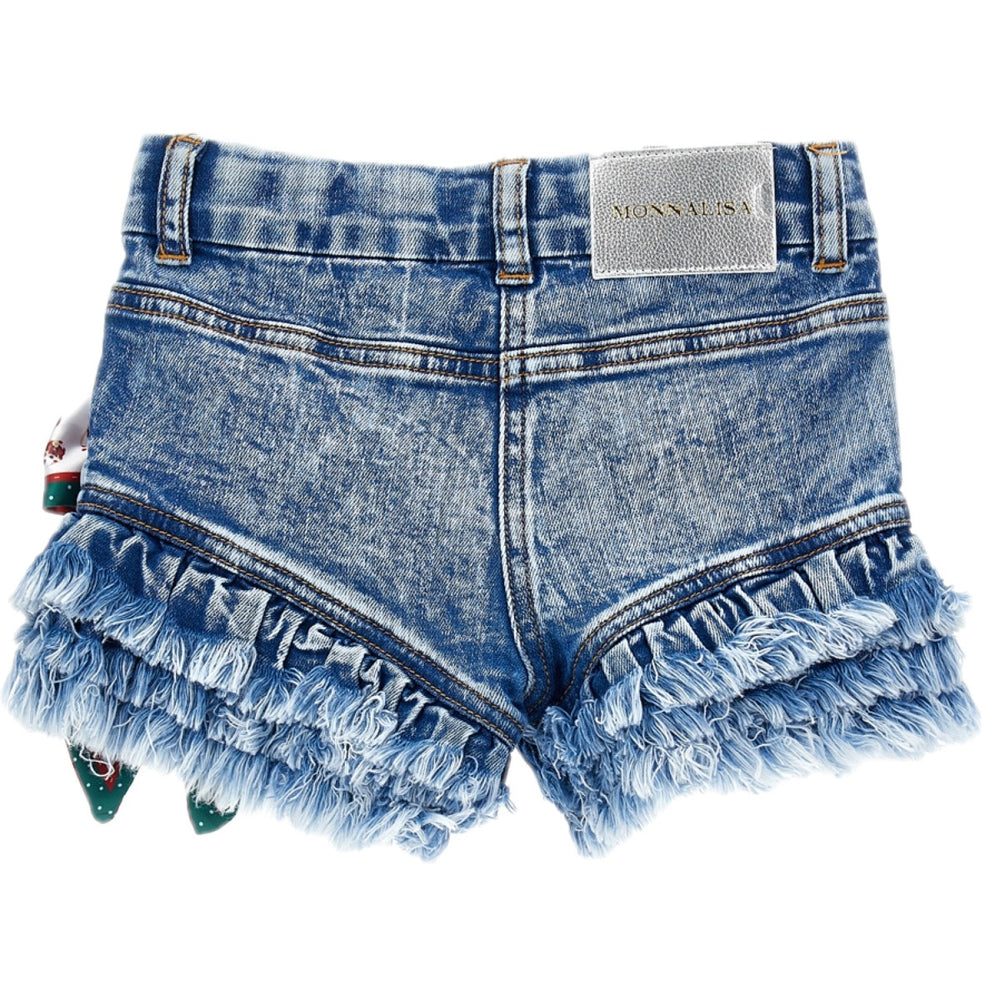 Shorts MONNALISA in jeans con rifiniture sfrangiate, fiocco applicato in tessuto e colori a contrasto, chiusura con bottone logato e zip, tasche laterali, logo applicato sul retro.