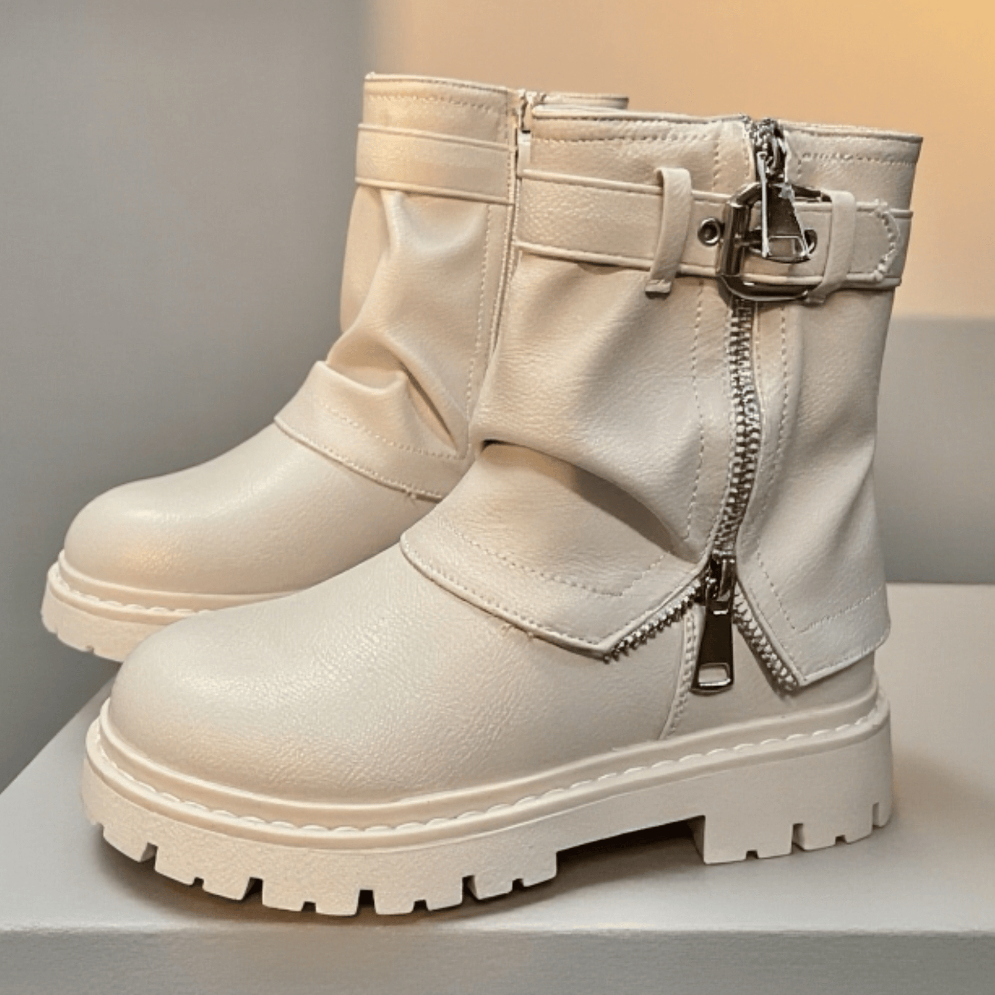Stivaletti panna con applicazioni, fondo in gomma antiscivolo.
