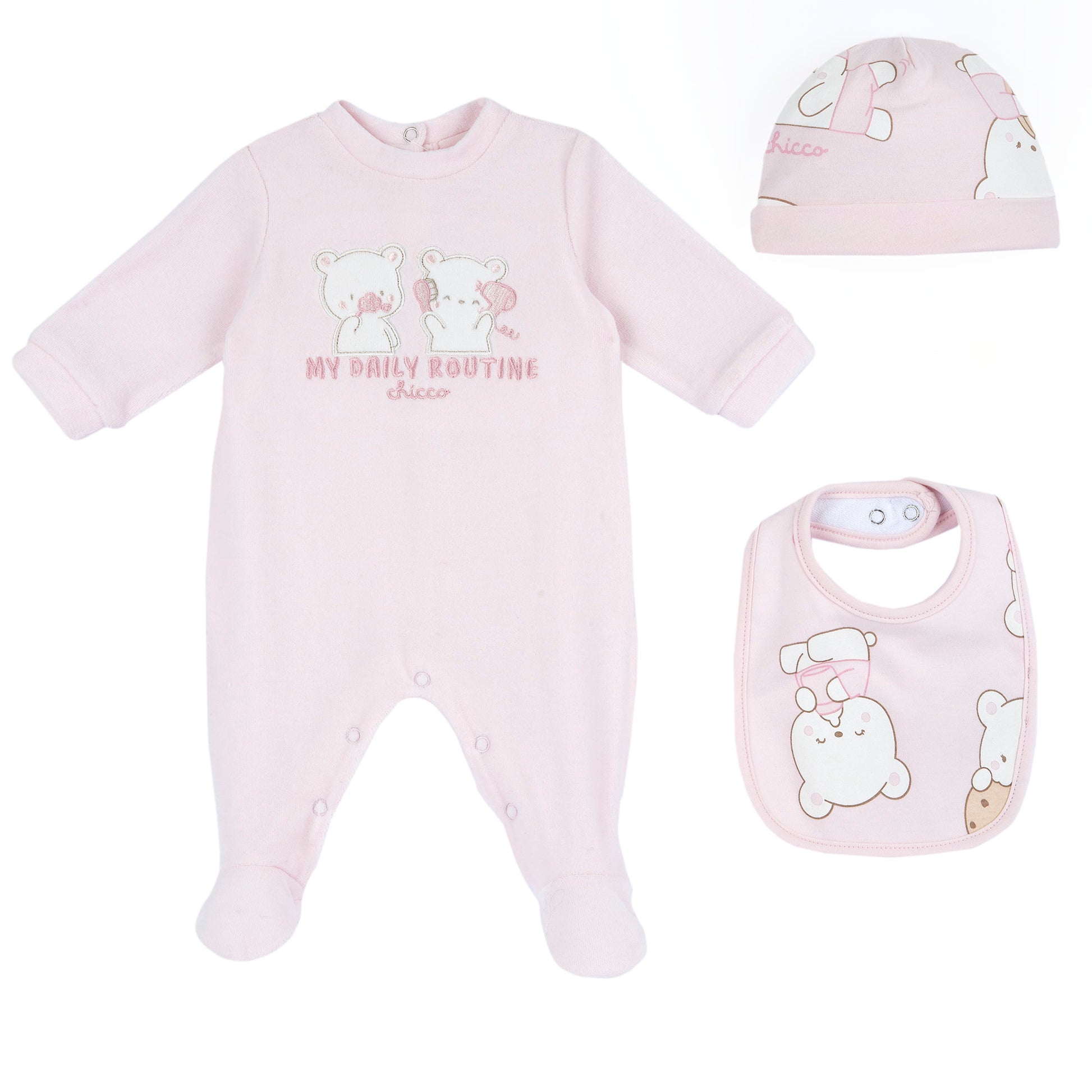 Set CHICCO composto da tutina in ciniglia con patchs e ricami, chiusura con clips , bavetta con retro in spugna e chiusura clips , cappello in caldo cotone con risvolto a fantasia.