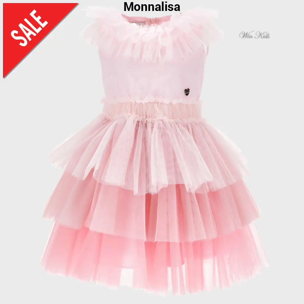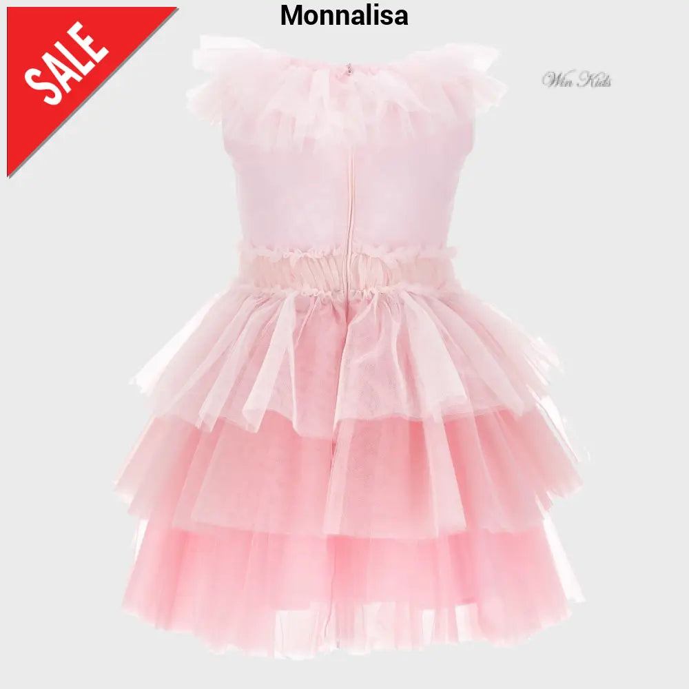 Monnalisa Dress Crease Ride mangas em tule com saia multivol,Terminando com Ruches, Fechamento Zip nas costas, logotipo do coração aplicado, forro de algodão.