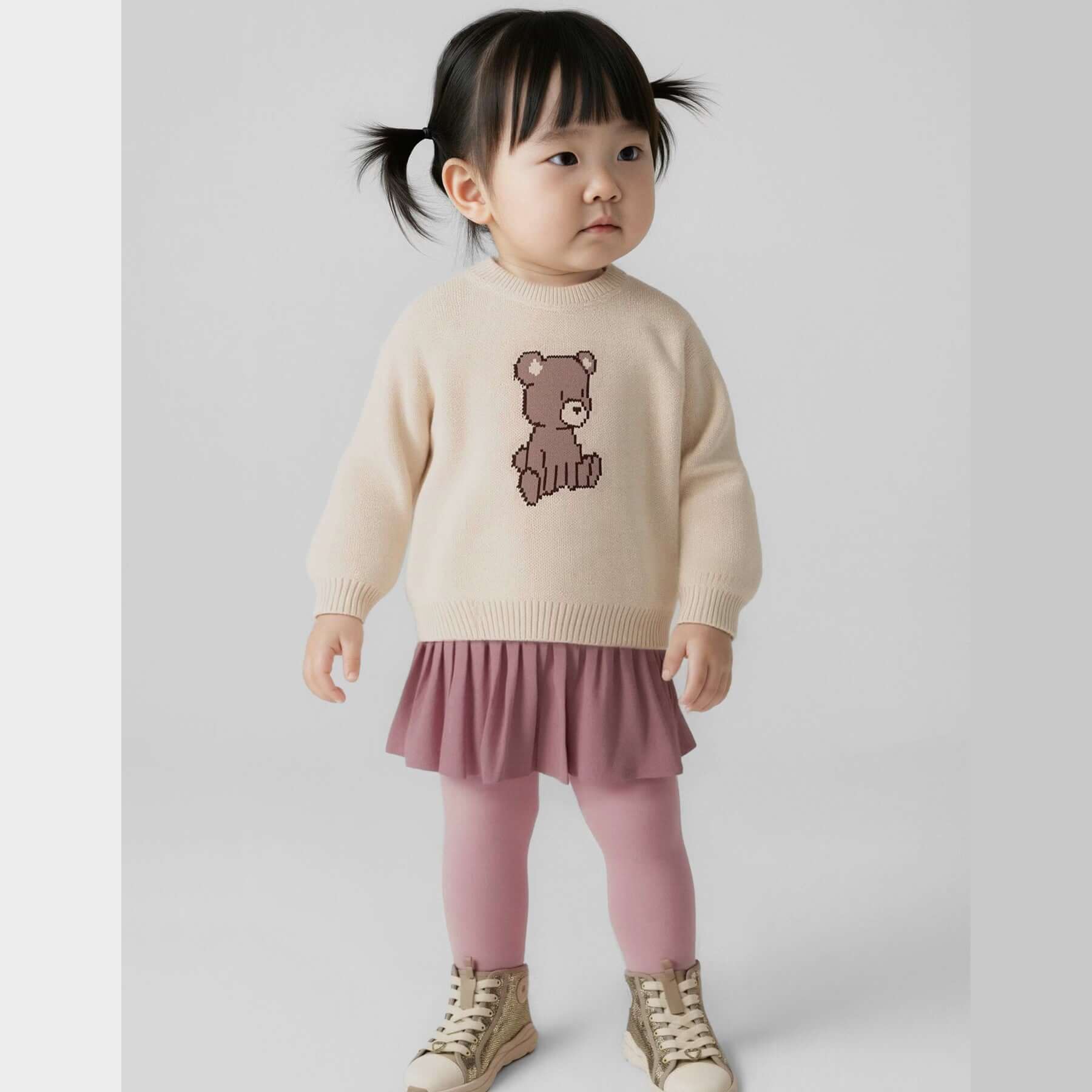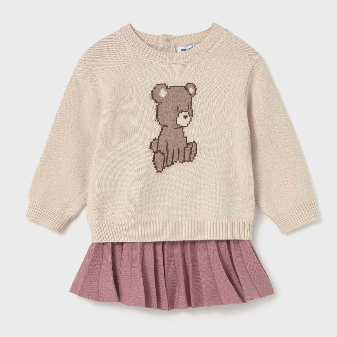 Conjunto MAYORAL com suéter ursinho e saia plissada com elástico na cintura.