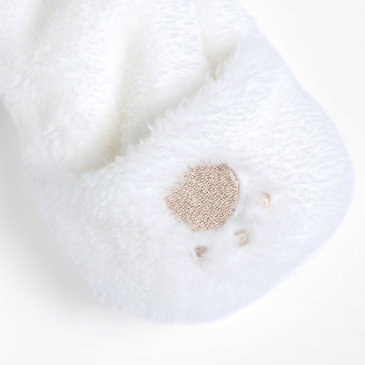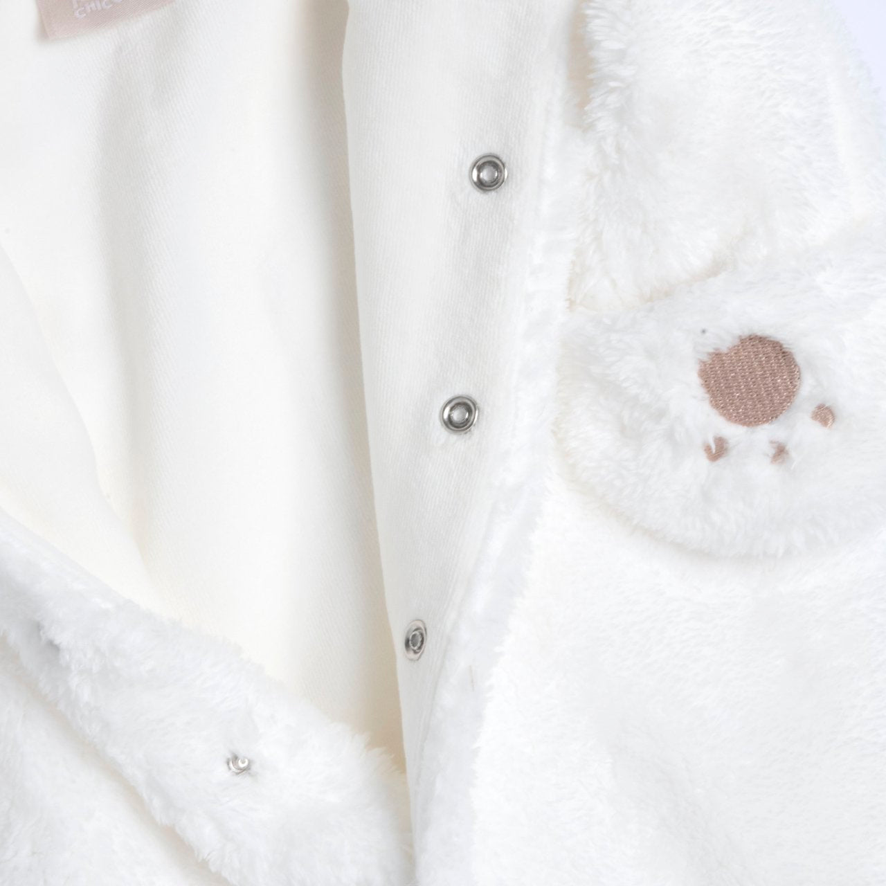 Macacão macio estilo esquimó em tecido macio, interior em chenille, fecho de clipe. Bordado no capuz e orelhas aplicadas. O pulso dobrável cobre as mãozinhas. Produto com certificação Oeko-Tex: qualidade para o seu filho.