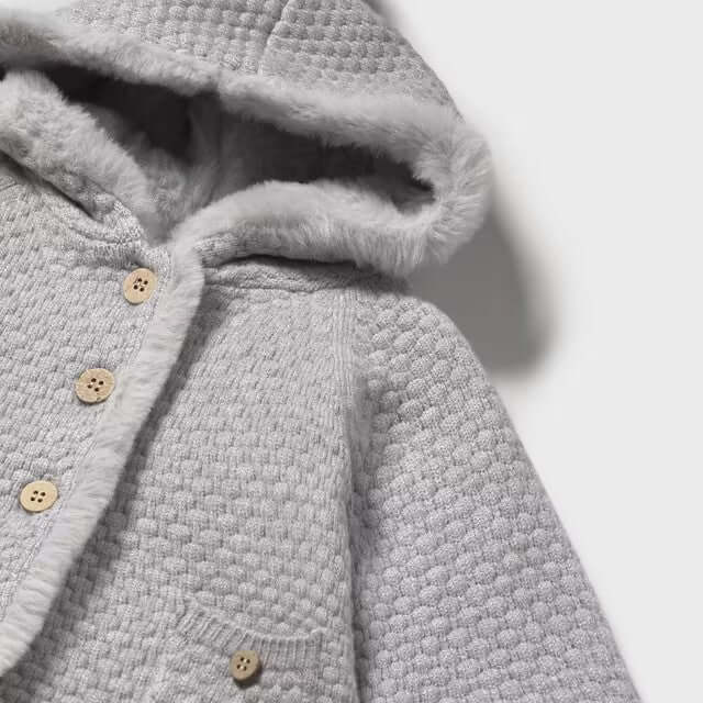 Casaco em tecido MAYORAL com acabamento em pele sintética, fecho de botão. Pompon no capô.