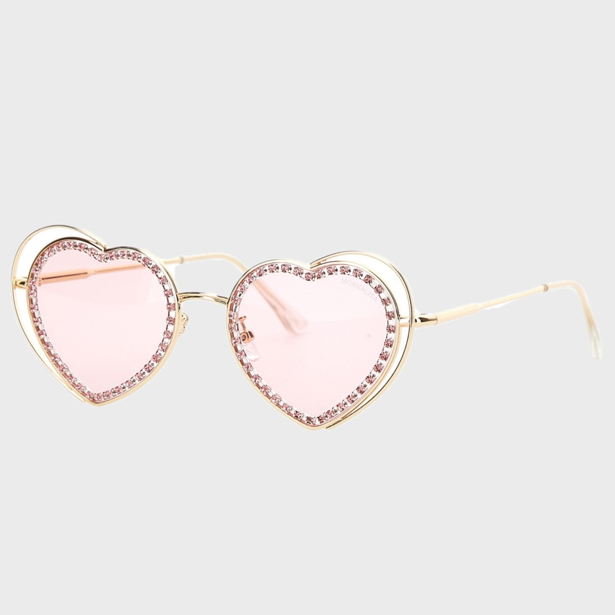 Óculos Monnalisa com strass aplicados, logotipo impresso aplicado na lente, suporte de óculos com morcentam com monte de carabiner e logotipo pingente de coração cardíaco. Proteção UV 400.