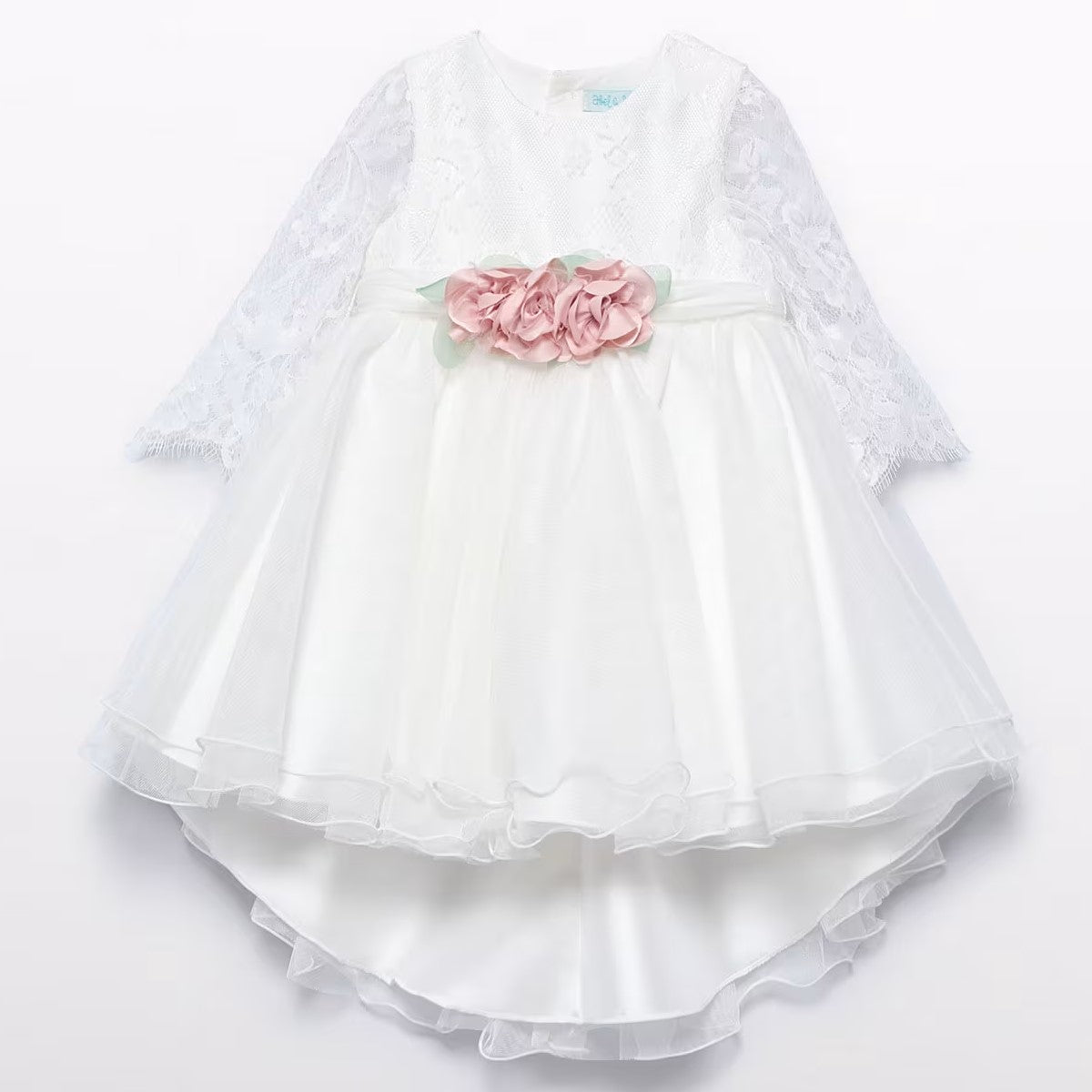 Vestido Abel & Lula, modelo assimétrico, com a parte superior em renda trabalhada, parte inferior em tule de bola múltipla, fechamento com botões na parte traseira, cinto de tule na vida com aplicações contrastantes e curvadas na parte traseira com fechamento de clipes, revestimento interno de algodão.