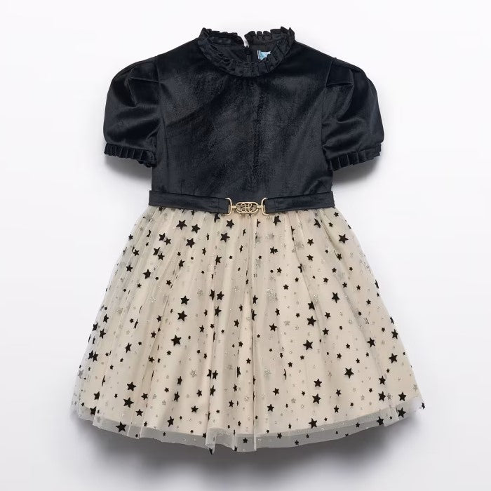 Vestido Abel & Lula Velvet com tule inferior com estrelas glitter e veludo aplicado, forro de algodão, fechamento de zíper na parte traseira, cinto de veludo com fivela de logotipo -in -metal e fechamento com clipes na parte de trás.