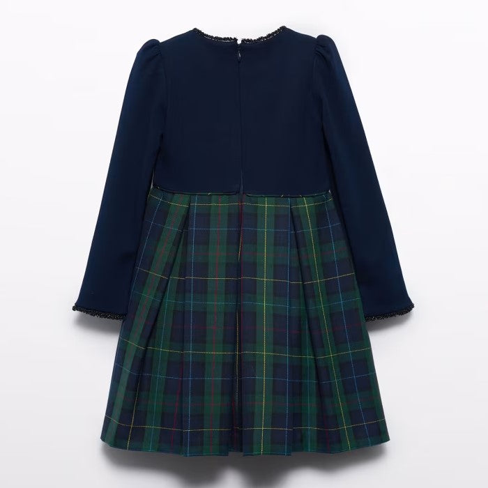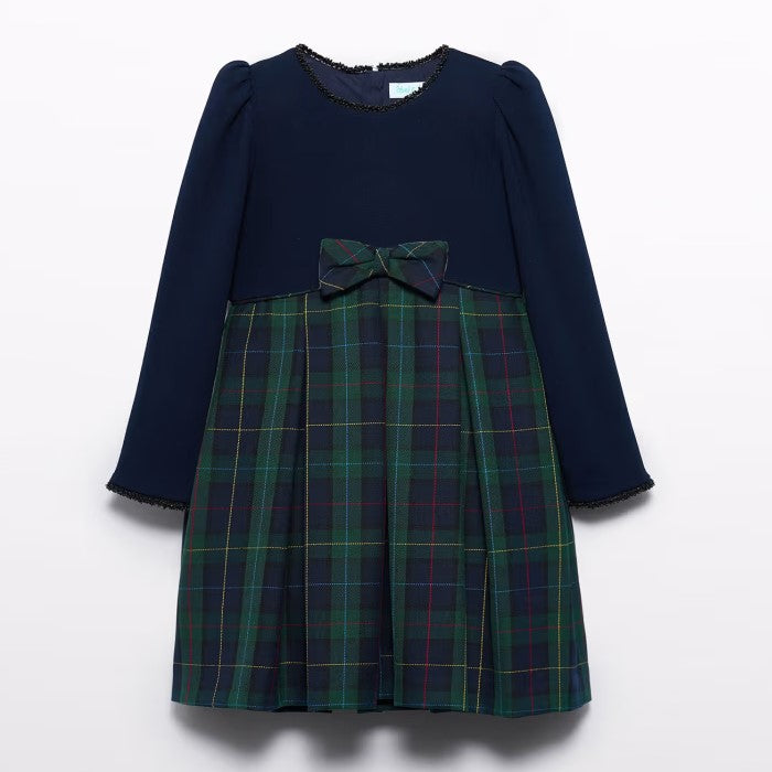 Vestido Abel & Lula em pinturas de tecidos de fantasia na parte inferior, arco aplicado, contas aplicadas aos punhos e à tripulação, fechamento de zíper na parte traseira, forro interno de algodão.